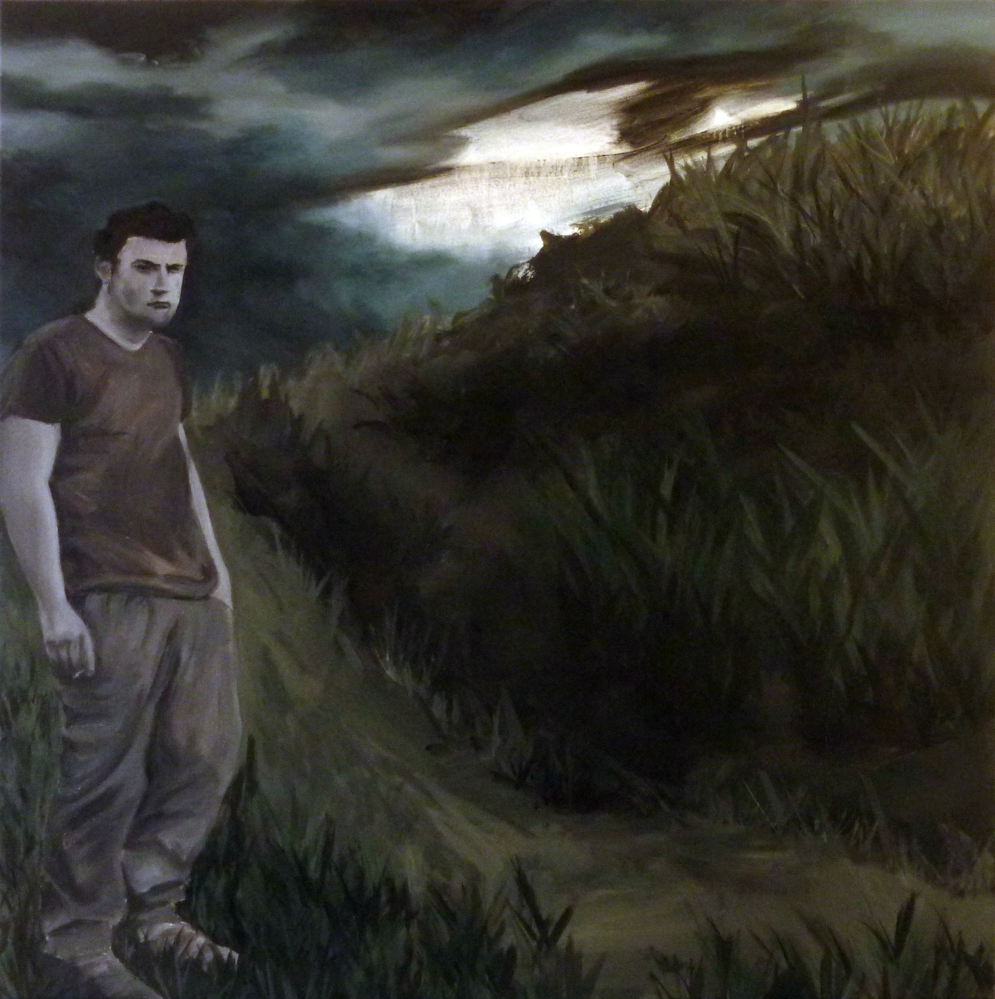 Avec ses décors décharnés et post-apocalyptiques, ses sous-bois peuplées d’êtres égarés, ses cieux bas et lourds, au bord de la fêlure, et ses mystiques désuètes faites de monolithes cinématographiques, les peintures tragiques de Linda Roux nous convient à des ballades dans des espaces se situants toujours "entre deux". Entre la vie et la mort, entre chien et loup, entre le calme et la tempête, entre le végétal et le béton, entre le quotidien et le fantastique, ou encore le paisible et l’inquiétant.